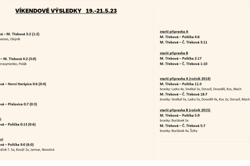 muži A M. Třebová – Svitavy 0:1 (0:0) muži B M. Třebová – Sloupnice 0:0 (0:0) ženy Jevišovice-Mikulovice – M. Třebová 5:2 (3:2) branky: Benková …