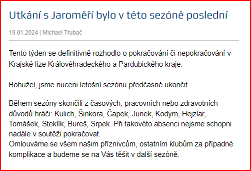 Minulý týden také přišla zpráva z týmu z Opočna o předčasném ukončení sezóny: