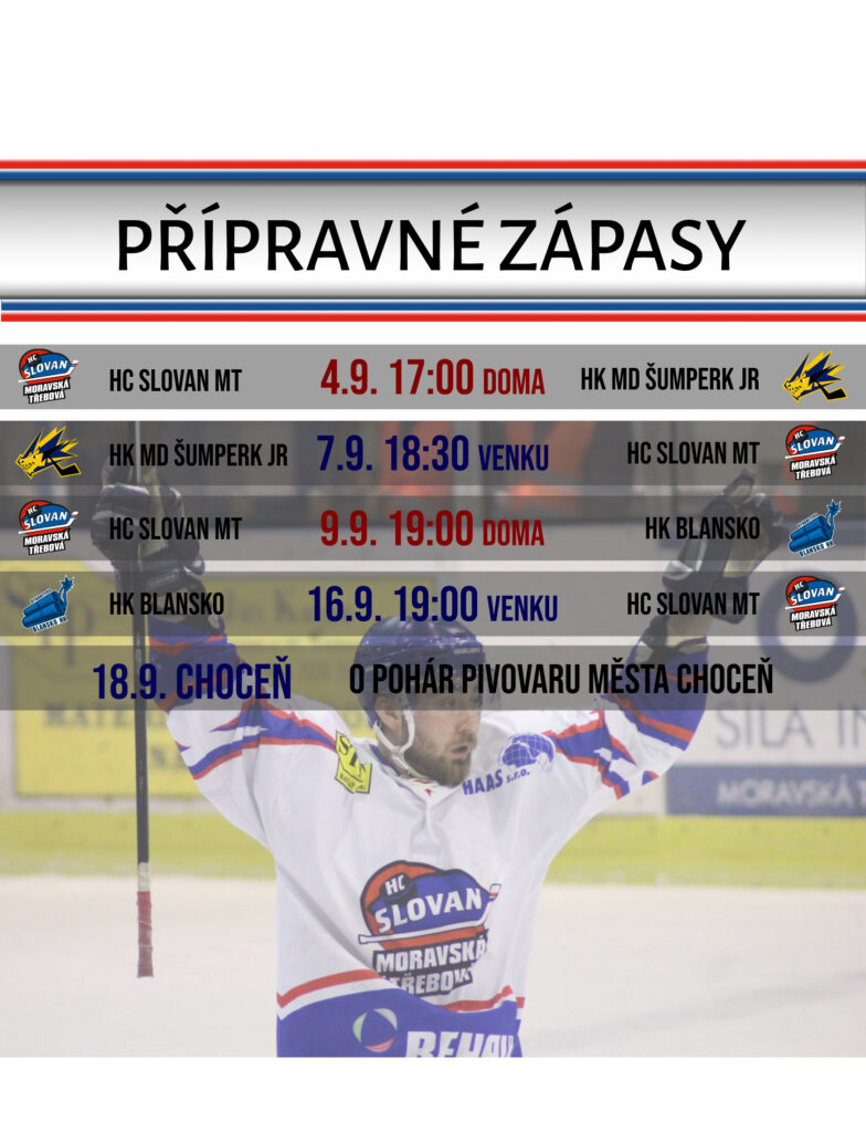 aktualizováno 31. 8. 202231. 8. 2022Lední hokej HOKEJ – Přípravné zápasy Áčka Vendula Bečvářová Více info na stránkách klubu: HC Slovan Moravská Třebová – Oficiální web hokejového klubu HC Slovan Moravská Třebová