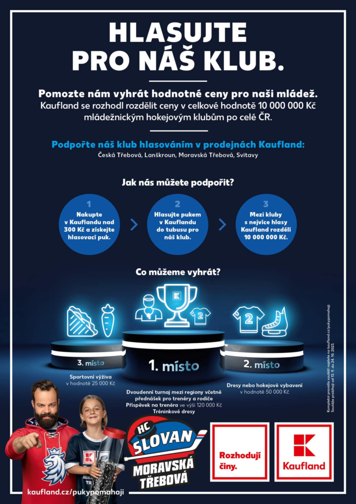 V termínu od 13. 9. do 24. 10. stačí nakoupit v prodejnách Kaufland za 300 Kč a spolu s účtenkou si vzít i puk za nákup. Ten následně vhodit do tubusu s názvem našeho klubu. Hlasovat pro nás můžete na prodejnách: Česká Třebová, Lanškroun, Moravská Třebová, Svitavy.