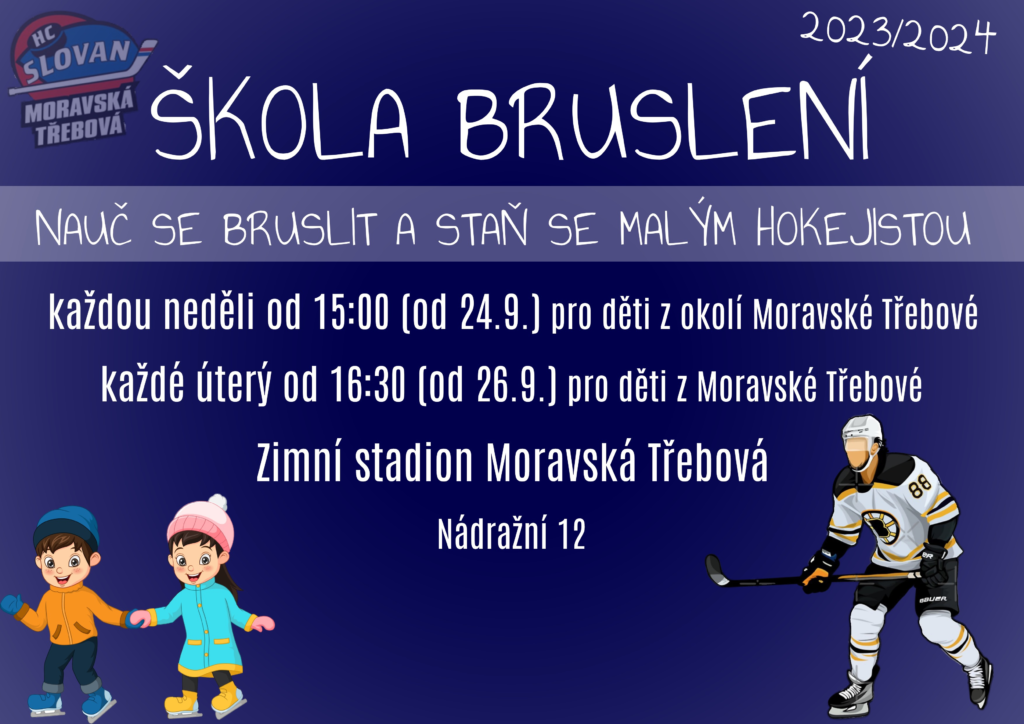aktualizováno 4. 9. 20234. 9. 2023Lední hokej Škola bruslení Vendula Bečvářová Více informací na stránkách hokejového oddílu: Škola bruslení – HC Slovan Moravská Třebová
