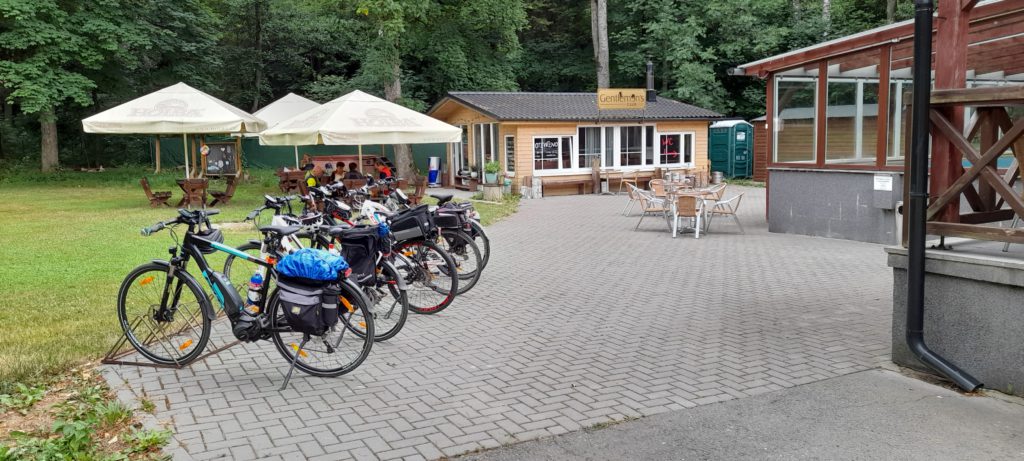 Skupina cyklo se od Křížové hory vydala na opačnou stranu. Kolem PR Mokřiny jsme sjížděli na Moravský Karlov, potom vystoupali na Písařovské sedlo, projeli celým  Písařovem a dále lesem přes Hambálek, pod Pustinou a kolem rybníka Sychrov jsme dojeli na Horní Studénky. Následoval Svébohov, Václavov a Růžové údolí u Zábřeha. Zde je nové hezké občerstvení, které jsme k posilnění a krátkému odpočinku náležitě využili. S novými silami jsme přes Zábřeh a Nemile najeli na známou cyklostezku, která nás dovedla do Hoštejna a přes Krasíkov, Třebařov a Staré Město a s prvními kapkami deště jsme po 65 km v Moravské Třebové.