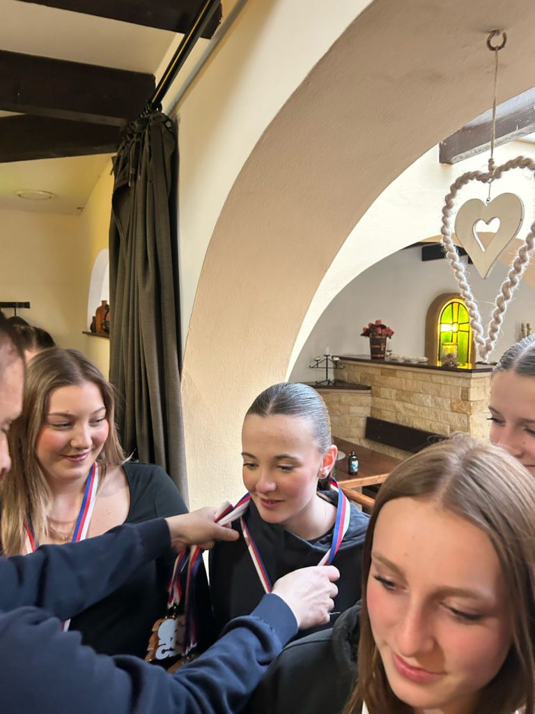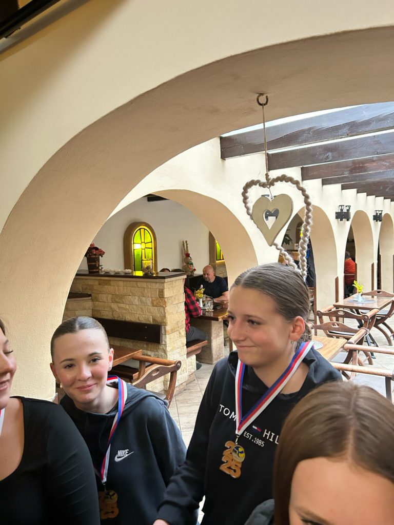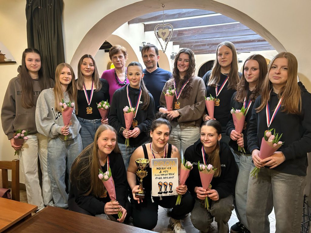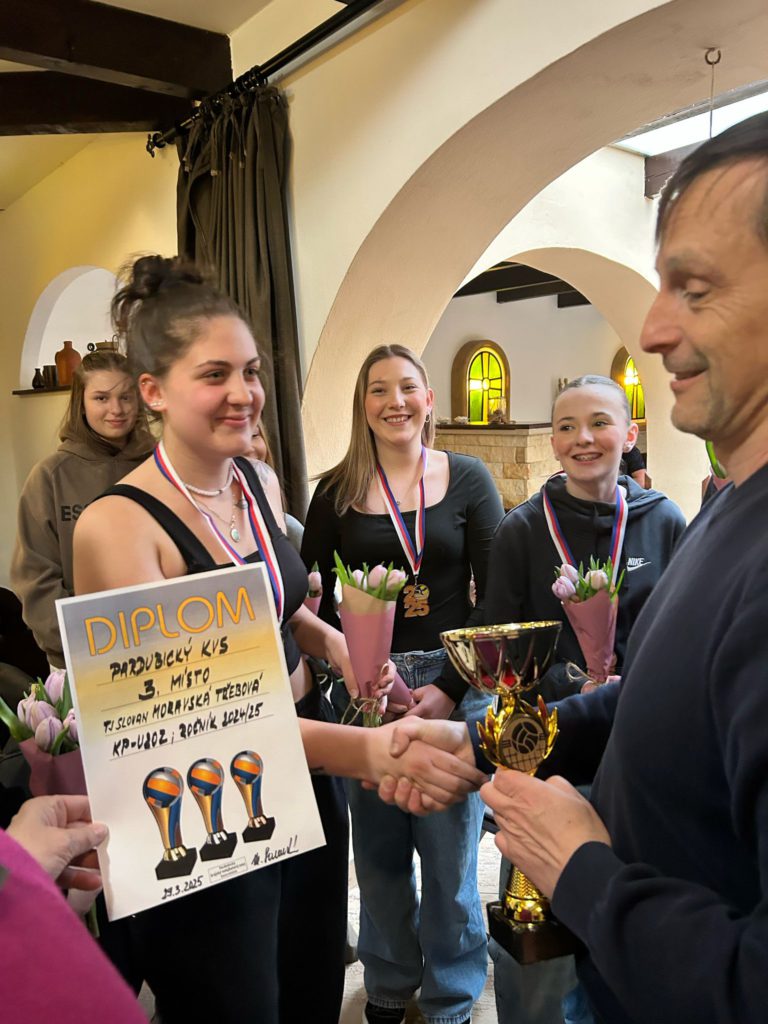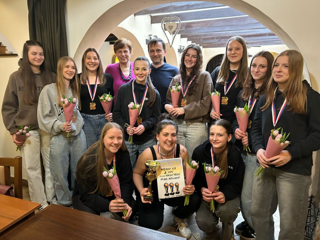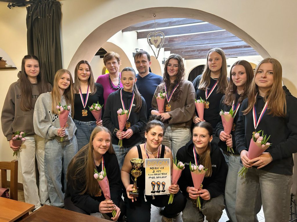 Volejbalistky převzaly z rukou předsedy TJ Slovan Ladislava Weinlicha a trenérky Hany Vávrové ocenění za 3. místo v přeboru pardubického kraje kategorie U20.