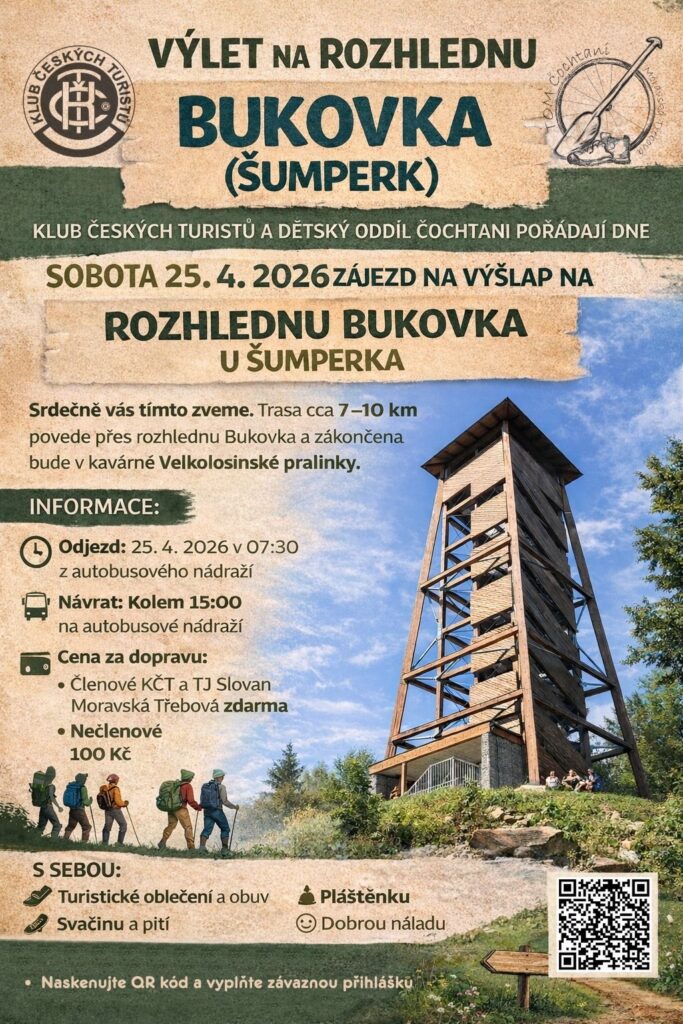 Klub český turistů a dětský oddíl Čochtani pořádají dne 25. 4. 2026 zájezd na výšlap na rozhlednu Bukovka u Šumperka.