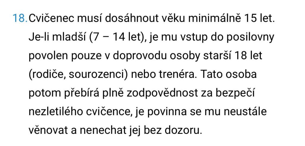 Prvním je BEZPEČNOST. V posilovně je manipulováno s těžkými břemeny a mohlo by dojít ke zdravotní újmě mládeže, která nesportuje pod dohledem odpovědné osoby.