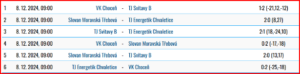 Starší žákyně (U16Z) vyjely na poslední turnaj před Vánoci do Chocně. Postupně se utkaly s Chvaleticemi, domácí Chocní a Svitavami B. Soupeřkám nedovolily získat ani jediný set a po třech výhrách 2:0 postoupily opět do skupiny B.